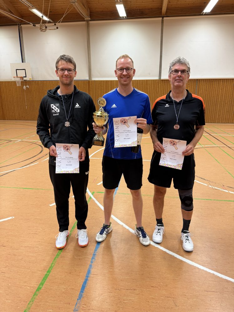 Richtig spannend wurde es dann ab 13.00 Uhr, als die Erwachsenen dran waren. Das Turnier wurde wieder im Schweizer System durchgeführt wird, in dem per Computer in sieben Runden die jeweiligen Spielpaarungen ermittelt werden. In Runde drei musste der Mitfavorit Mario Czogalla gegen Klaus Ruoff alles geben, um einen 1:2 Satzrückstand noch in einen Sieg zu verwandeln. In den nächsten beiden Runden besiegte Czogalla sowohl den Titelverteidiger Rainer Hoksch als auch dessen Sohn David Hoksch. Letztendlich gewann Mario Czogalla das Turnier ungeschlagen mit 7:0 Siegen (bei 21:3 Sätzen) und wurde Vereinsmeister 2026. Auf den Plätzen folgten David Hoksch (5:2), Rainer Hoksch (4:3), Henry Atzkern (4:3) und Roland Kraus (4:3), der in der Schlussrunde überraschend Roland Kriesche niederrang. Bei den Damen war die Entscheidung schnell klar, denn Gabi Hoksch war ohne Konkurrenz, da die letztjährige Siegerin Monika Stock nicht antreten konnte.